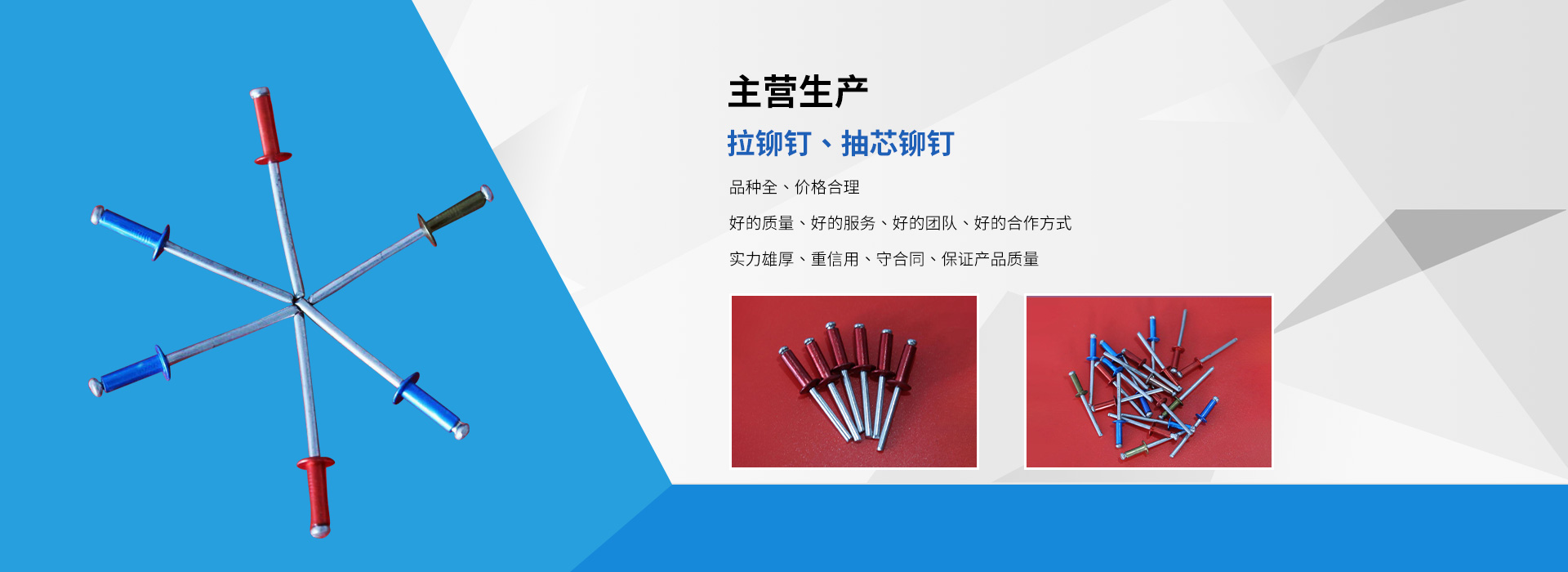 臨沂市龍牌異型鉚釘廠是拉鉚釘、抽芯鉚釘等產(chǎn)品生產(chǎn)加工的個(gè)體經(jīng)營(yíng),公司總部設(shè)在臨沂市羅莊區(qū),臨沂市龍牌異型鉚釘廠具有完整、科學(xué)的質(zhì)量管理體,公司自成立以來(lái),一直秉承“質(zhì)量為準(zhǔn),客戶至上”的經(jīng)營(yíng)理念,以產(chǎn)品“品種豐富、價(jià)格合理”,在消費(fèi)者當(dāng)中享有較高的身分,得到了廣大消費(fèi)者的信賴(lài)與好平,公司并與多家零售商和代理商建立了長(zhǎng)期穩(wěn)定的合作關(guān)系,公司實(shí)力雄厚,重信用、守合同、產(chǎn)品質(zhì)量放心,以多品種經(jīng)營(yíng)特色和薄利多銷(xiāo)的原則,歡迎廣大消費(fèi)者前來(lái)洽談業(yè)務(wù)!